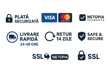 Plata se poate face cu cardul, rapid si sigur, prin serviciul de plată NETOPIA Payments, sau ramburs, la curier.